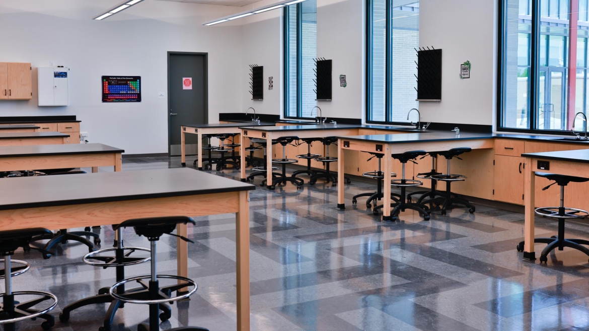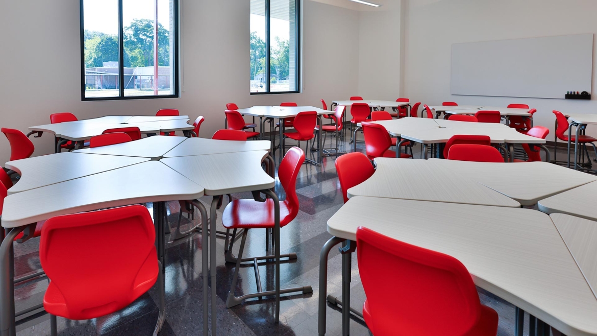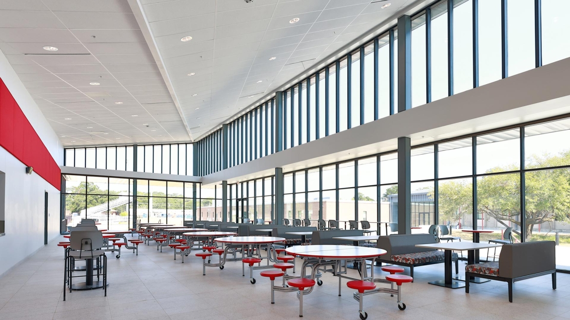 The Manning team brought the School Board's vision of a cohesive, connected campus to life. A central focus of the new design is a spacious courtyard that interacts with indoor spaces like the cafeteria, which features high ceilings and expansive windows overlooking the courtyard and practice field. Classrooms, too, benefit from tall ceilings and large windows that flood the space with natural light, creating an open and airy environment for learning.