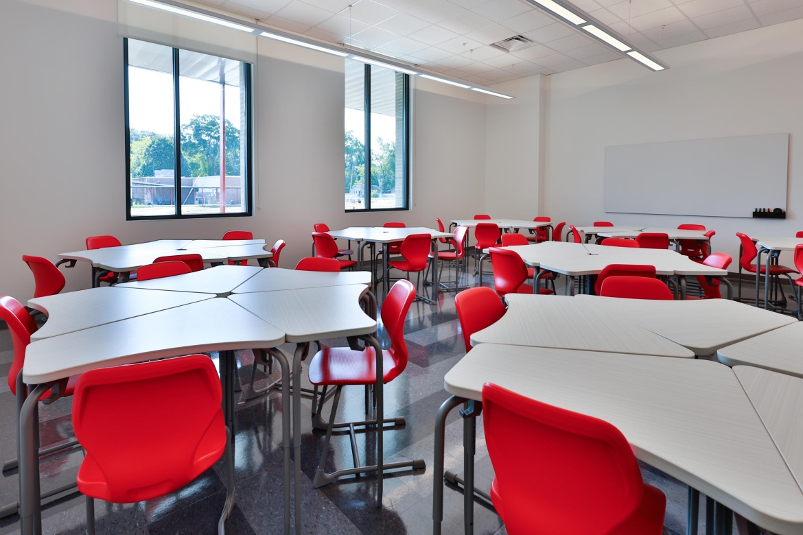 This consolidation of total square footage allowed the design team to reorient buildings and site features for a planned progression of movement through the site, maximizing the site’s natural features and opening space for outside activities. The new site layout also allowed the design team to redesign the stormwater management system that included a detention pond, alleviating continual flooding problems, and to consolidate utilities into a new central plant for the entire campus. Wayfinding has also been improved by reducing the number of vehicular entrances and creating a primary entrance into the building. Walkways conduct students and visitors through the site.