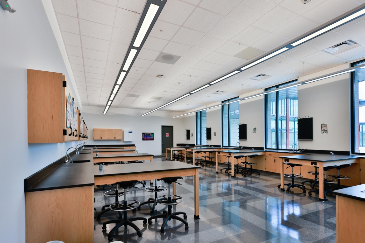 After an analysis of the 125,000 square feet of existing buildings, Manning proposed demolishing 60,000 square feet of existing buildings that were obsolete or damaged beyond usefulness, renovating the remainder, and adding 40,000 square feet in an efficient footprint. The resulting new building houses academics, administrative and guidance offices, media center, and athletic facilities in one building.