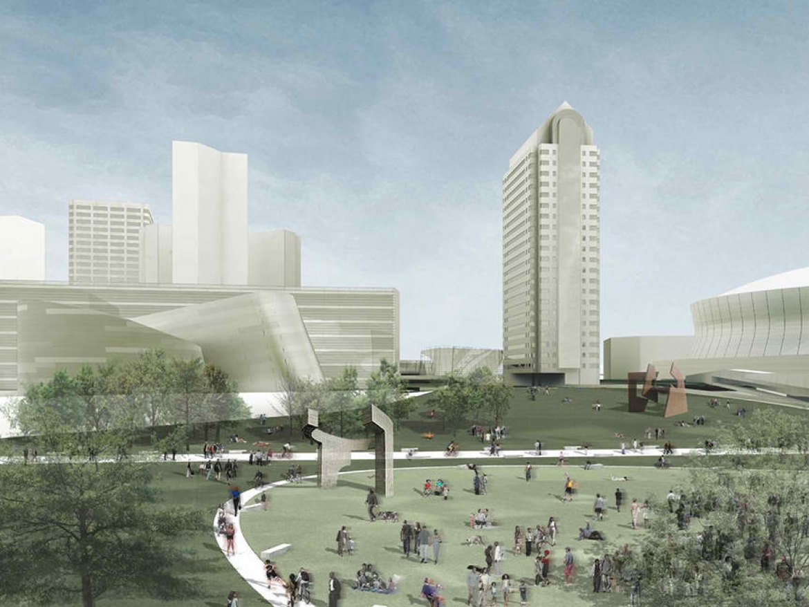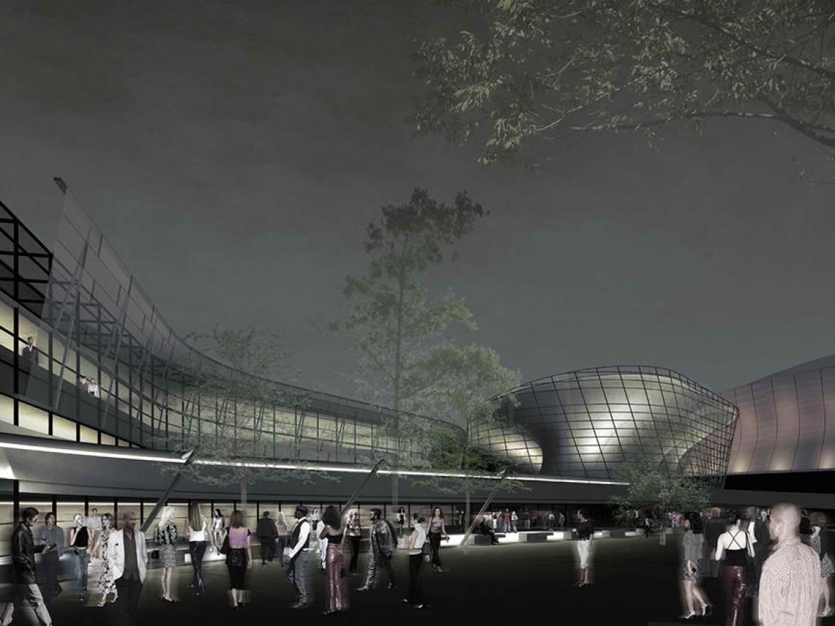 The conceptual design for the National Jazz Center was the result of a collaboration between Thom Mayne, Manning, and Eskew+Dumez+Ripple. The center would include a 20,000-square foot performance center with seating for up to 1,000 guests; a 300-seat black-box theatre; 70,000-square foot amphitheater with lawn seating; 60,000-square foot children's education center; rehearsal studios and a much needed archive for jazz research.